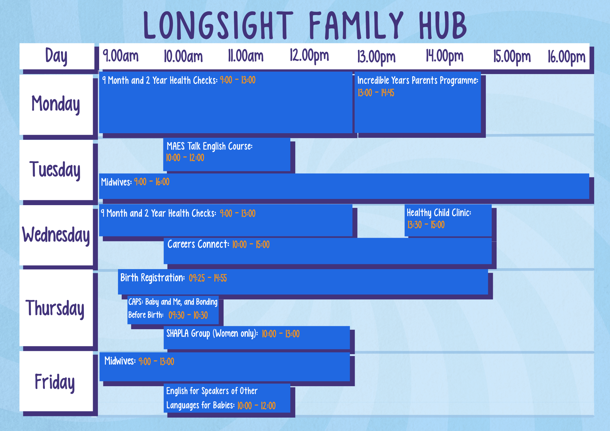 The Longsight Family Hub offers a range of services including parenting support, early years activities, health and wellbeing sessions, and advice on education, employment, and family life. We work closely with schools, health visitors, community groups, and local organisations to ensure families are connected to the help they need — from pregnancy through to the teenage years (up to 19 years or 25 years for those with SEND)