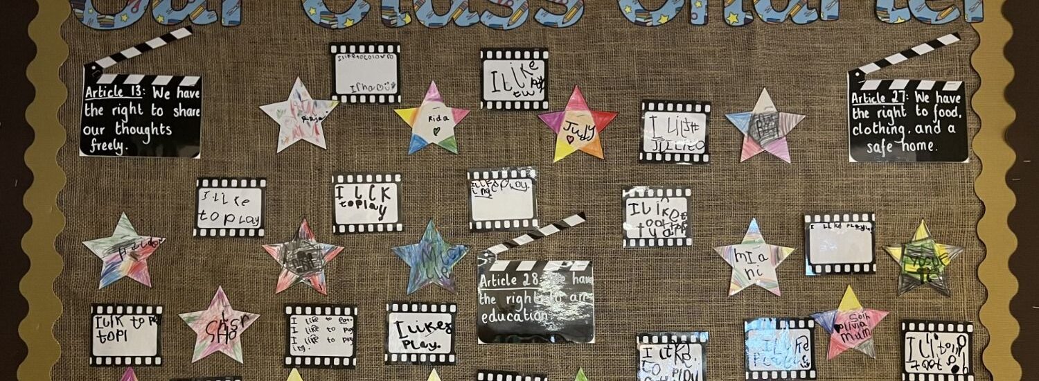 These are our Rights Respecting Class charters. Each class works together with the teacher to create a set of agreed rules that all the children in the class will follow, with a focus on respecting the right of the child.