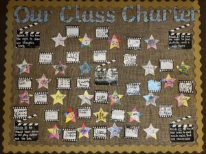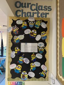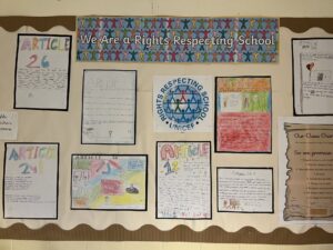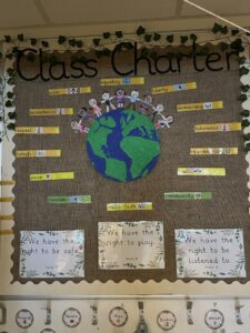 These are our Rights Respecting Class charters. Each class works together with the teacher to create a set of agreed rules that all the children in the class will follow, with a focus on respecting the right of the child.